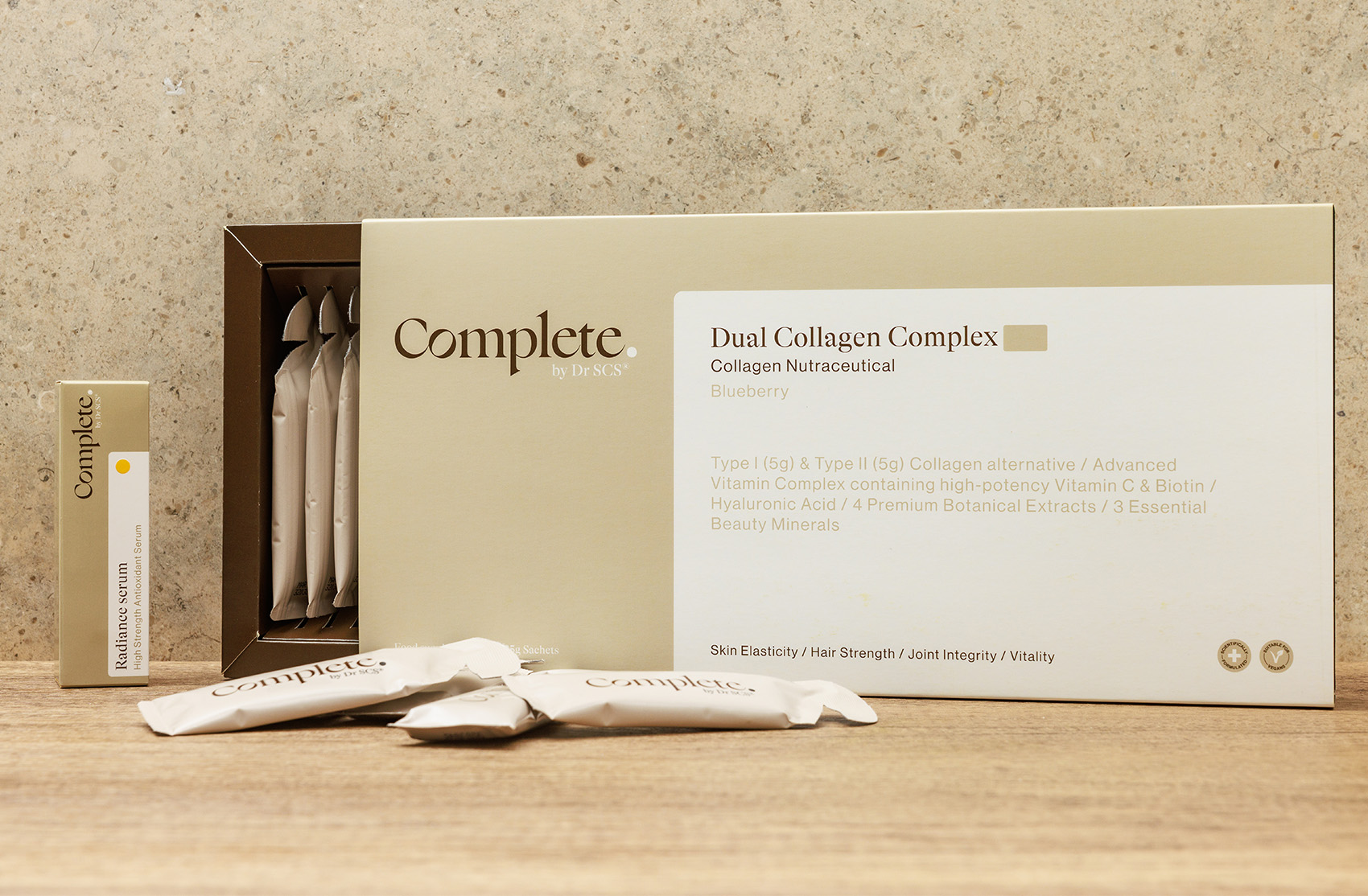 Complete dual-action anti-ageing solution combining targeted nutrition with clinical-grade topical treatment for youthful skin.